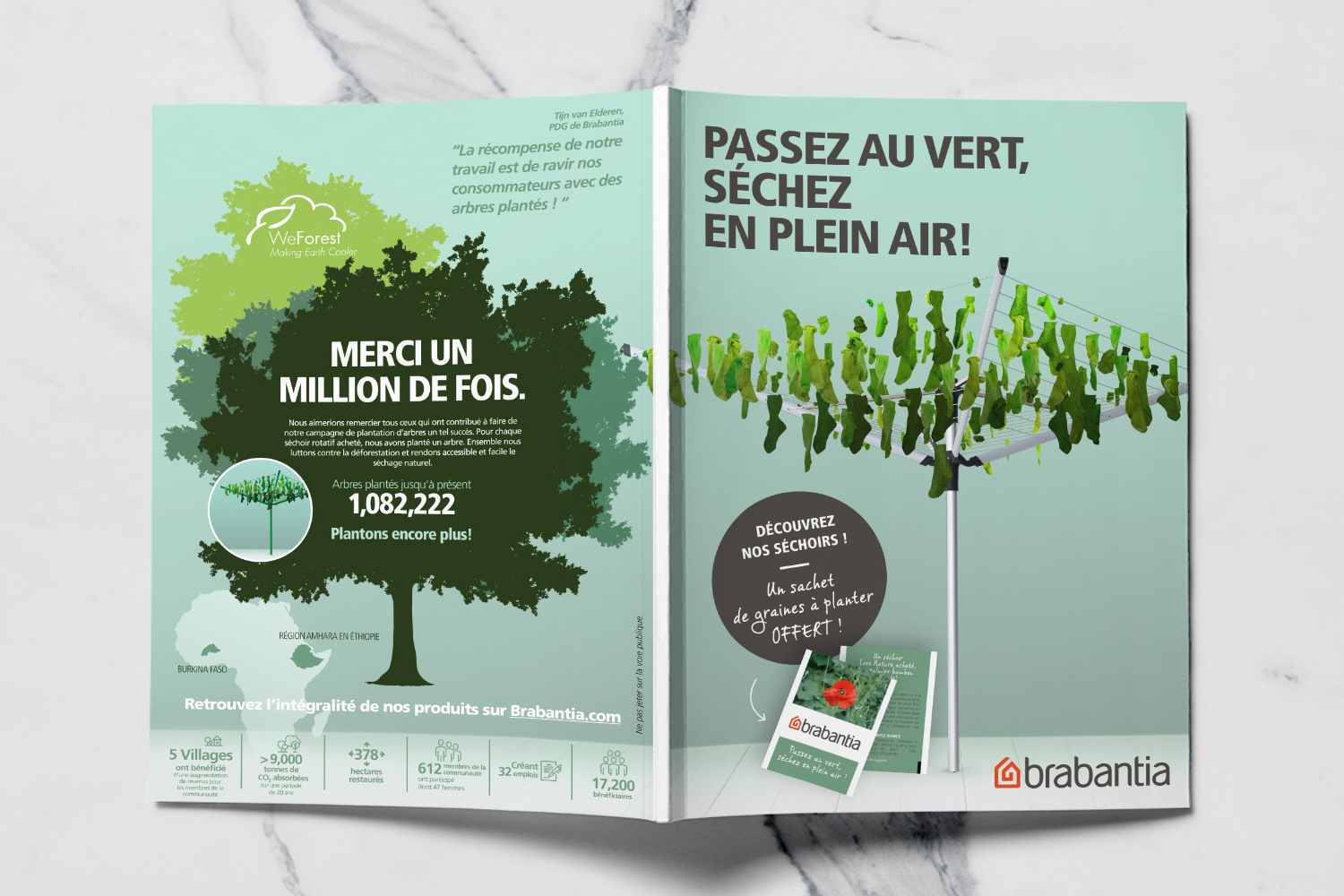 Opération commerciale Brabantia : un séchoir acheté, un arbre planté et une plante offerte. Création du support commercial, sachet de graines, dépliant, étiquette de la plante.